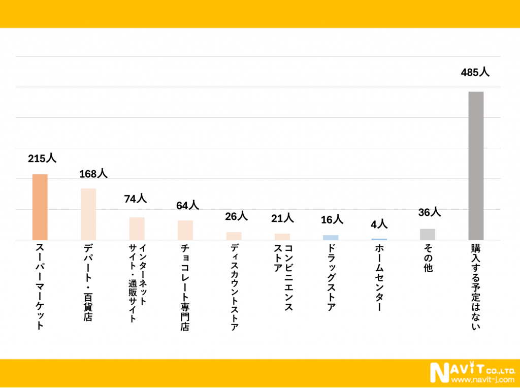 バレンタインに贈るお菓子をどこで購入するかというアンケートです。「スーパーマーケット」が一番多く215人、「デパート・百貨店」が168人、3番目に「インターネットサイト・通販サイト」が74人という結果になりました。