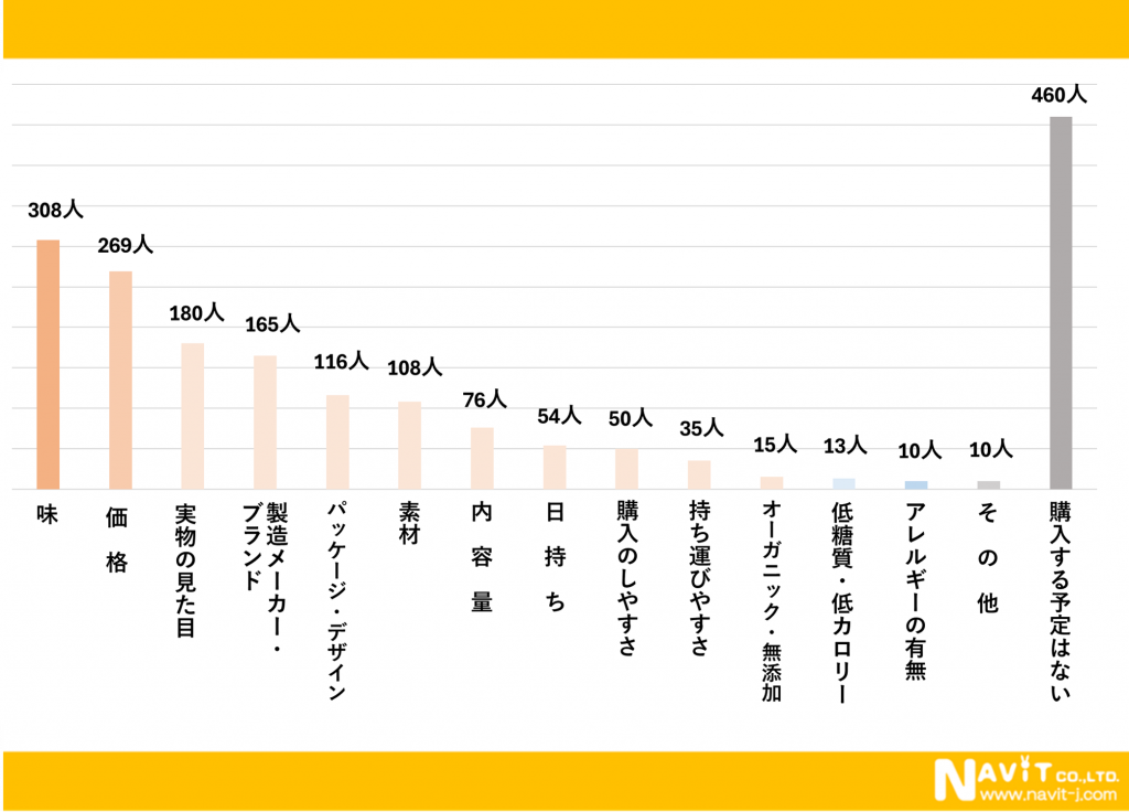 バレンタインの贈り物を選ぶ際の基準についてのアンケートを複数回答でいただきました。最も多かったものは「味」で308人、次に「価格」が269人、3番目に「実物の見た目」が180人という結果になりました。