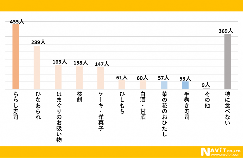 「ひな祭りに食べるものといえば何ですか?」という質問を複数選択可で行ったところ、「ちらし寿司」が433人、「ひなあられ」が289人、「はまぐりのお吸い物」が163人という順になりました。