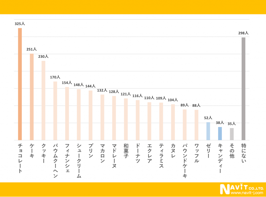 結果は以下の通りになりました1番多かったのは「チョコレート」で325人、次に多かったのは「ケーキ」で251人、3番目に多かったのは「クッキー」で230人という結果になりました。ホワイトデーで欲しいものとしては、洋菓子が人気があるようです。