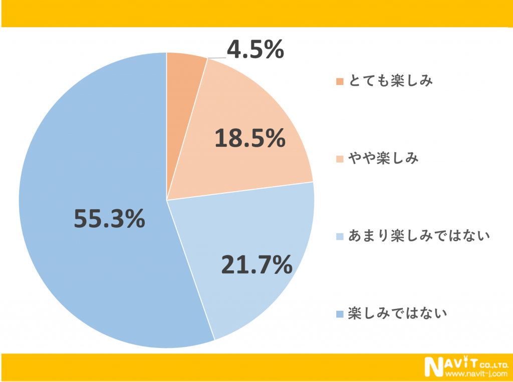 ホワイトデーは楽しみですか?というアンケートに対して、「とても楽しみ」と答えた人が4.5%、また「やや楽しみ」と答えた人が18.5%という結果になりました。
