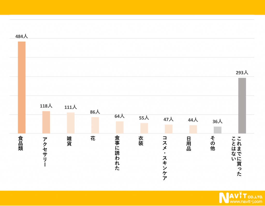 一番多かったのは「食品類」で484人、次に多かったのが「アクセサリー」で118人、3番目に多かったのが「雑貨」で111人という結果になりました。やはりホワイトデーは、お菓子をはじめとする食品類をもらうことが多いようです。