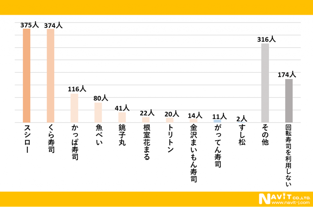 「よく利用する回転寿司店はどこですか?」という質問を複数選択可で行ったところ、「スシロー」が375人、「くら寿司」が374人、「かっぱ寿司」が116人と続きました。スシローとくら寿司を利用している人が多いようです。