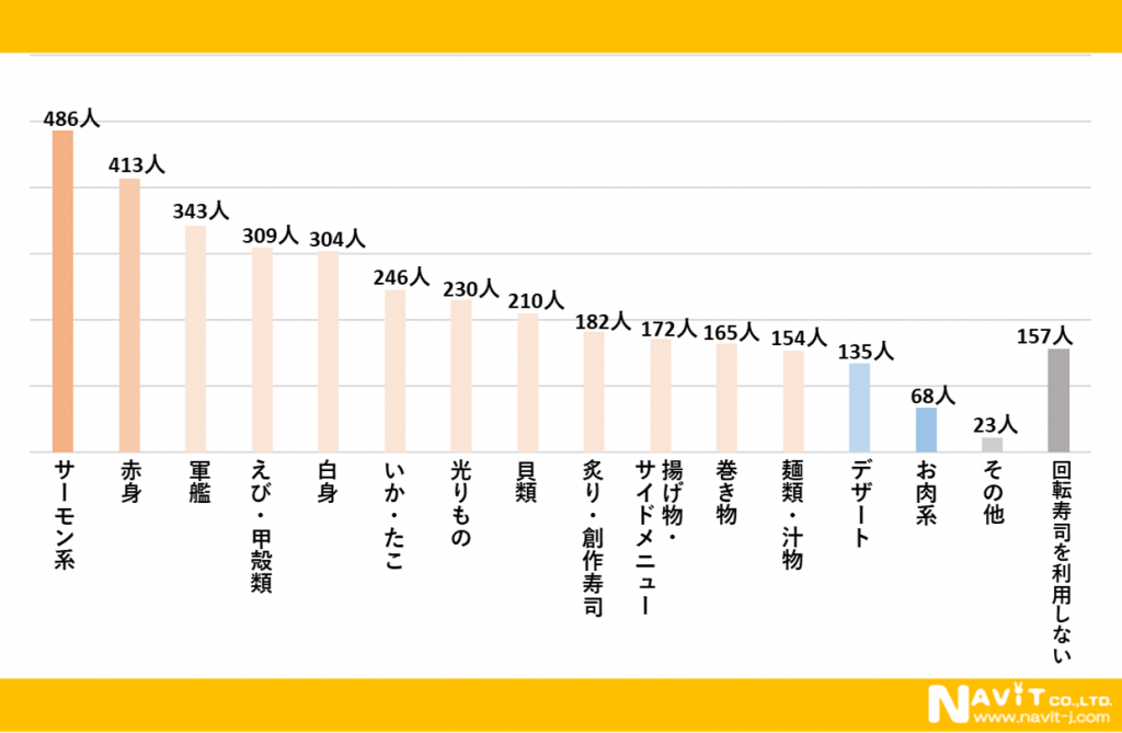 「回転寿司でよく注文するメニューのジャンルはどれですか?」という質問を複数選択可で行ったところ、「サーモン系」が486人、「赤身」が413人、「軍艦」が343人と続きました。サーモン系が人気のようです。