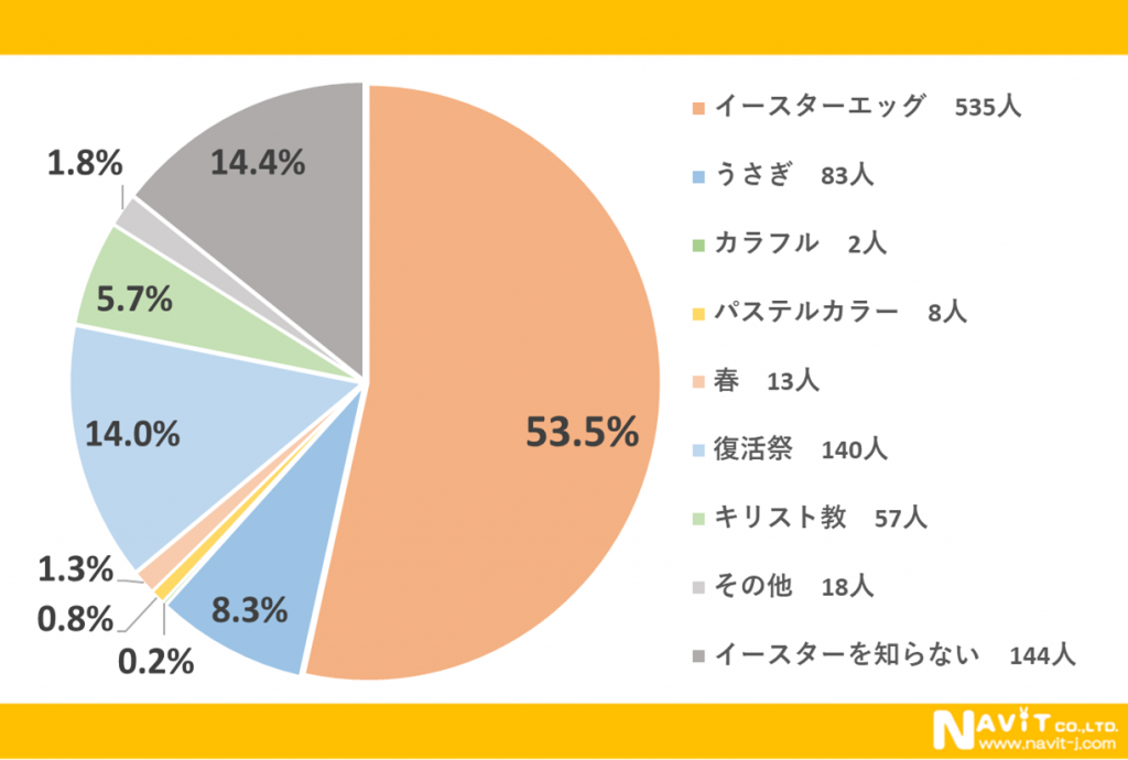 「イースターと聞いて最初にイメージするものは何ですか?」という質問については、「イースターエッグ」が53.5%、「復活祭」が14.0%、「うさぎ」が8.3%という順になりました。イースターエッグの卵のイメージを持っている方が多いようですね。