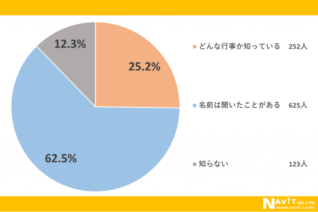 「イースターについてどの程度知っていますか?」という質問については、「どんな行事か知っている」が25.2%、「名前は聞いたことがある」が62.5%という結果になりました。名前は聞いたことがあるという方が多いようです。