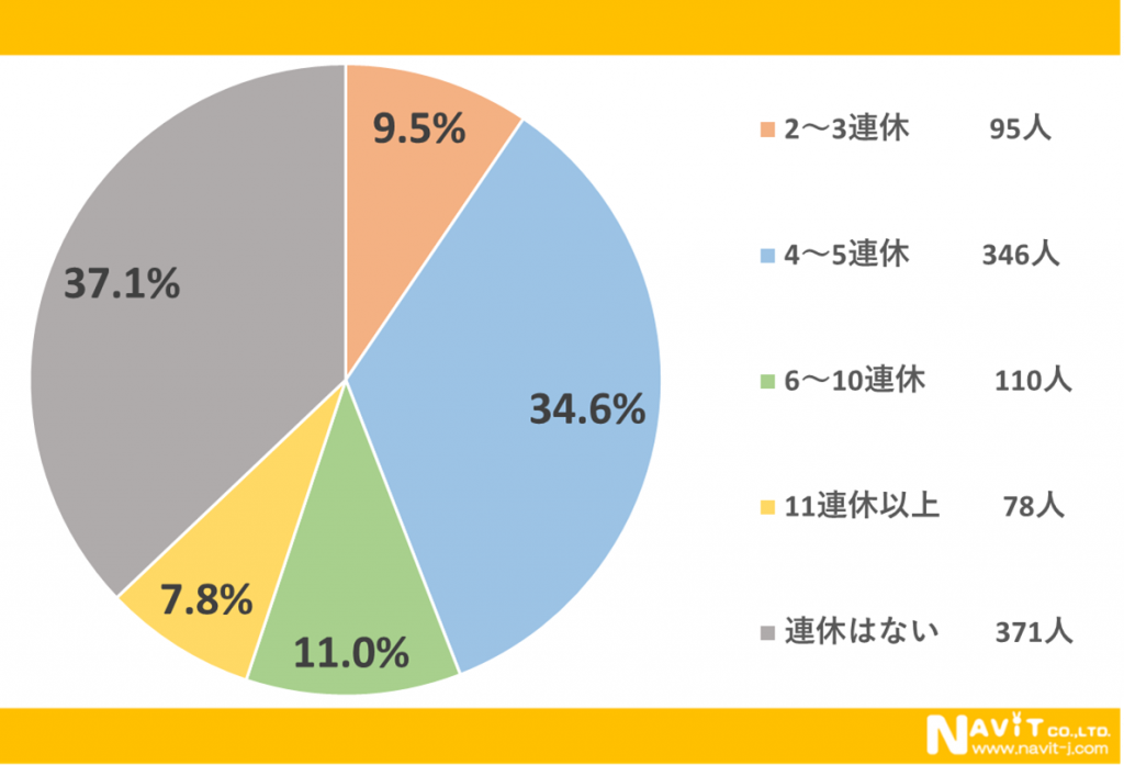 「今年のゴールデンウィークは何連休の予定ですか?」という質問については、「4~5連休」が34.6%、「6~10連休」が11.0%、「2~3連休」が9.5%という順になりました。一方、「11連休以上」という方も7.8%いらっしゃいましたよ。全体で見ると、暦通りの休日数の方が多いのかもしれませんね。