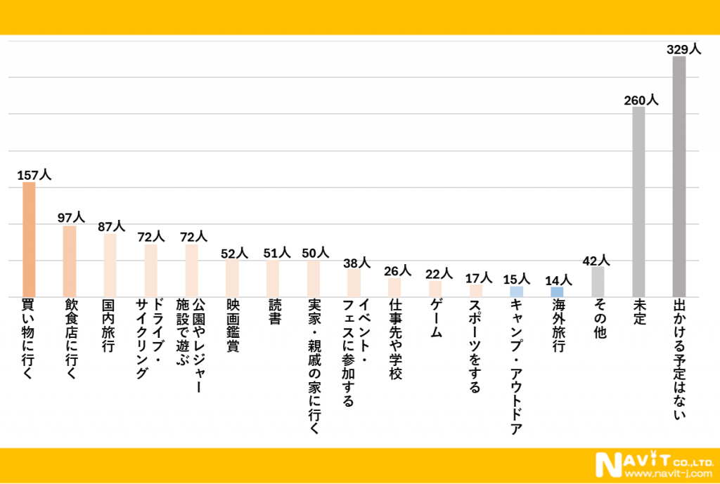 「今年のゴールデンウィークは何をしに出かけますか?」という質問を複数選択可で行ったところ、「買い物に行く」が157人、「飲食店に行く」が97人、「国内旅行」が87人という順になりました。