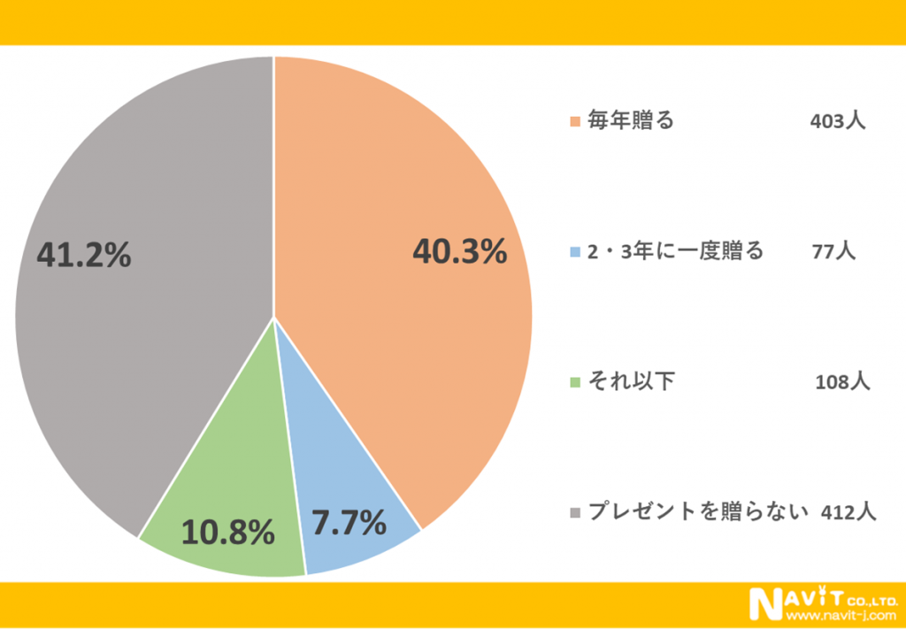 「母の日ギフトはどれぐらいの頻度で贈っていますか?」という質問については、「毎年贈る」が40.3%、「2・3年に一度贈る」が7.7%、「それ以下」が10.8%という結果になりました。毎年贈っている方が多いようですね。