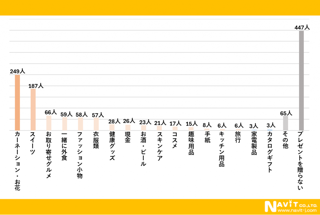 「今年の母の日にどのようなものをプレゼントする予定ですか?」という質問を複数回答可で行ったところ、「カーネーション・お花」が249人、「スイーツ」が187人、「お取り寄せグルメ」が66人と続きました。