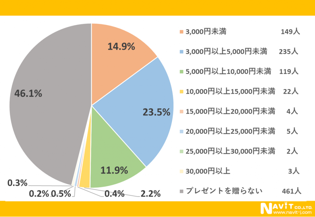 母の日に贈るプレゼントの予算については、「3,000円以上5,000円未満」が23.5%、「3,000円未満」が14.9%、「5,000円以上10,000円未満」が11.9%と続きました。
