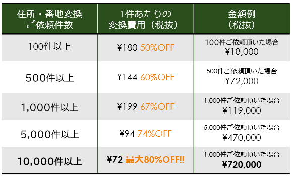 100件以上のお申込みより、最大80%OFFというお得なサービス価格にて、住所・地番変換を行わせていただきます。