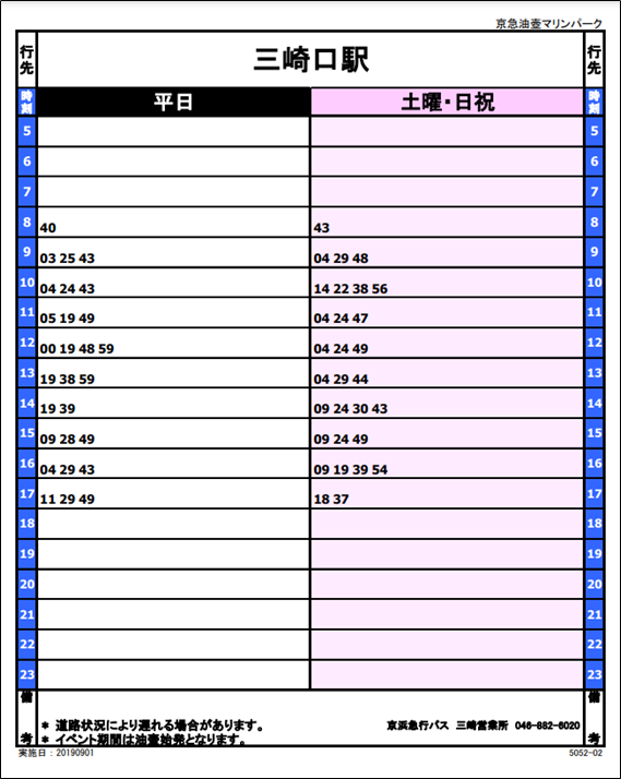 バスは平日と休日で運行パターンが異なる場合が多く、そのようなときは平日と休日を列で分けて表現することが多く、背景色を変えるなど、一目で区別できるような工夫をした時刻表もよく見かけます。例えば今日が日曜日ならピンク色の部分を見ることになります。