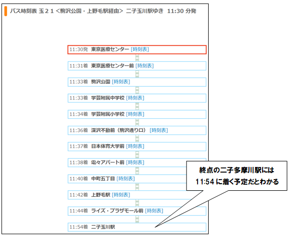 たとえば、11:30の便をクリックすると、この便が停車するバス停すべての到着時刻が表示され、終点の二子玉川駅には11:54着で24分かかることがわかります。