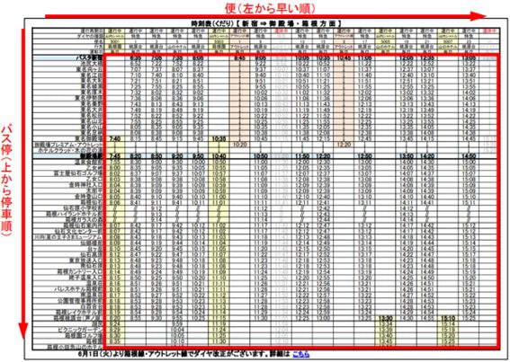 この時刻表の場合、上5行は便に関する情報で、運行日や便番号、行先などがかかれており、それぞれの列(縦方向の列)がどのような便なのかを簡単に把握することができます。