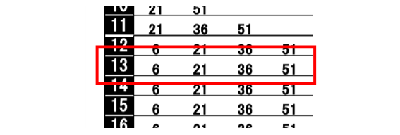例えば、現在の時刻が13:30だとすると、まず13時の行を見ます。分のところには、6分、21分、36分、51分が並んでいますから、この後いちばん早いバスは13:36に来る予定だということがわかります。