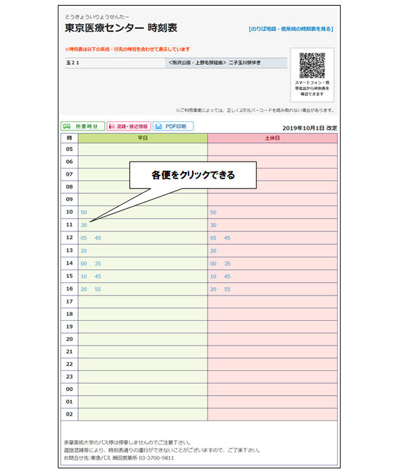 最近では、バス停だけでなく、ウェブサイトでもこの形式の時刻表が閲覧できる機会も増えました。すべてではありませんが、時刻がクリックできる場合、その便の各バス停の時刻を見ることができる場合もあります。
