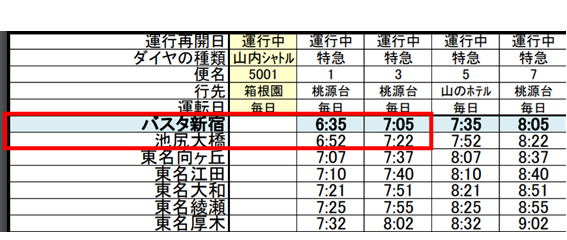 たとえば、6行目はバスタ新宿発の時刻で、3列目は特急1便で6:35、4列目は特急3便で7:05だということがわかります。また、7行目は池尻大橋発の時刻で、特急1便は6:52、特急3便は7:22だとわかります。