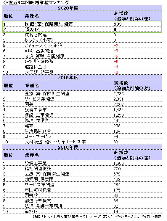 その中でも、「医療・薬・保険衛生関連」と「道の駅」のみが純増しています。