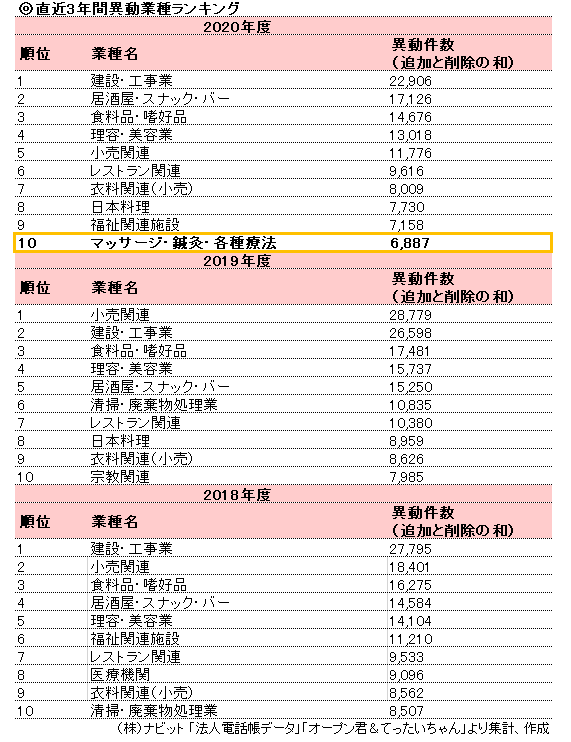 2018年・2019年にはトップ10に入らなかった「マッサージ・鍼灸・各種療法」が10位にランクインしています。