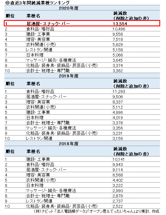 「居酒屋・スナック・バー」が昨年よりも多く減少しており、ランキングで1位となっています。