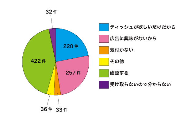 ポケットティッシュの広告を確認しない主な理由としては「ティッシュが欲しいだけだから」「広告に興味がないから」という答えがあがりました。