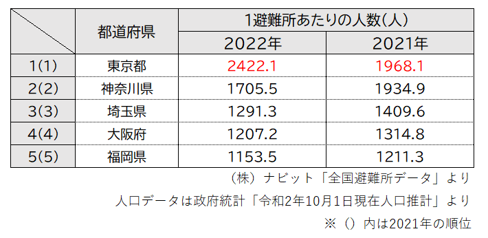 トピックスとしては、ワースト1の東京都のみ1避難所あたりの人数が454人も増加しています。