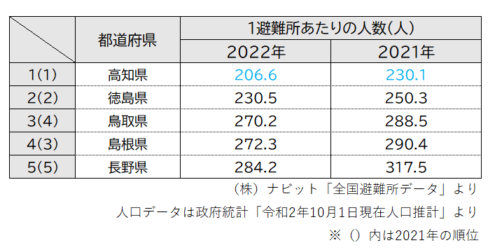 また、今年は避難所データと人口統計を比較し、都道府県毎の1避難所当り人口を比較してみました。ワースト5・トップ5の都道府県は以下の通りです。※()内は昨年の順位