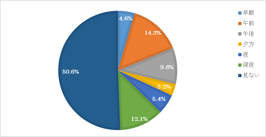 午前中が最も多く14.3%、次に深夜の12.1%、次いで午後9.8%となっています。午前中や深夜には番組形式のテレビショッピングがあることも、この時間帯の視聴が多い結果につながっているのでしょうか。夕方や夜は主婦の方は忙しいことも多いので、テレビ自体を見る時間がないのかもしれません。