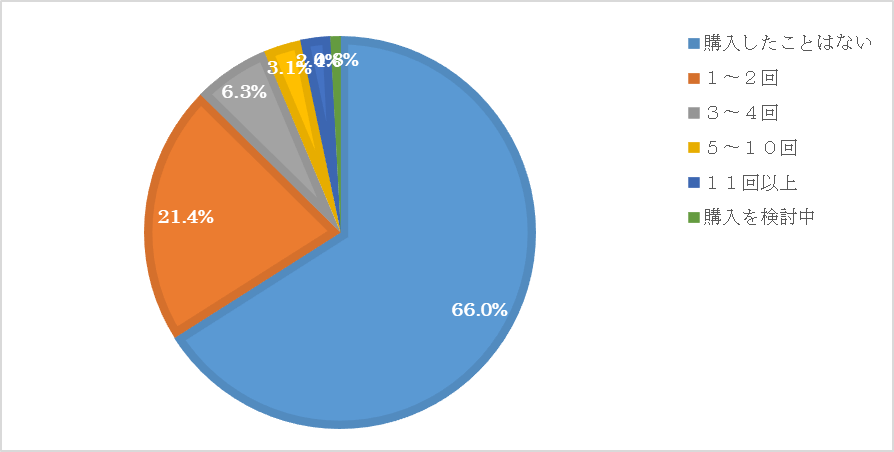 続いて、1~2回の購入が21.4%で、利用したことがある人の中では多く、見ていて1度は試してみたという人が多いと考えられます。
