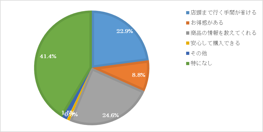 次に多いのが「店頭まで行く手間が省ける」22.9%。コロナ禍で店頭に行くことが難しくなった昨今では、特に大きなメリットです。また、テレビショッピングで扱っている商品の中にはあまり店頭で扱っていないものや、大型のものもあるので、そういった点でも店頭に行かずに購入できることはメリットです。