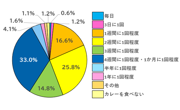 一番多かったのが「4週間に1回程度・1か月に1回程度」と回答した方で約3割となり、その次に多かったのが「2週間に1回程度」、「1週間に1回程度」「3週間に1回程度」と続きました。「毎日」や「3日1回」と回答した方も合計すると約9割となり、ほとんどの方が月に1回以上はカレーを食べているという結果になりました。やはり、カレーは家庭料理の定番のようです。