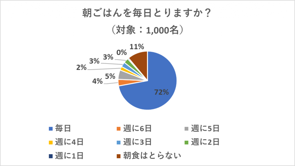 朝ごはんを毎日とると回答した人は72%という結果になり、大半の人が毎日朝ごはんを食べていることが分かりました。