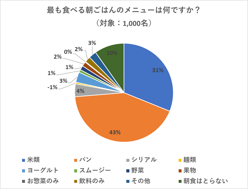 「最も食べる朝ごはんのメニューは何ですか?」というアンケートに対して、パンと答えた人は43%、米類と回答した人は31%と、パン派が多いことが分かりました。