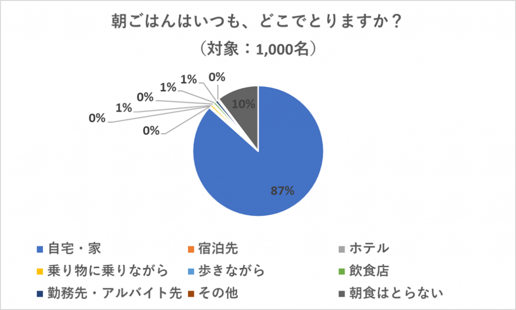 朝ごはんは、自宅・家でとると回答した人が87%となっており、9割近くの人が朝ごはんは、自宅や家で食べていることが分かりました。
