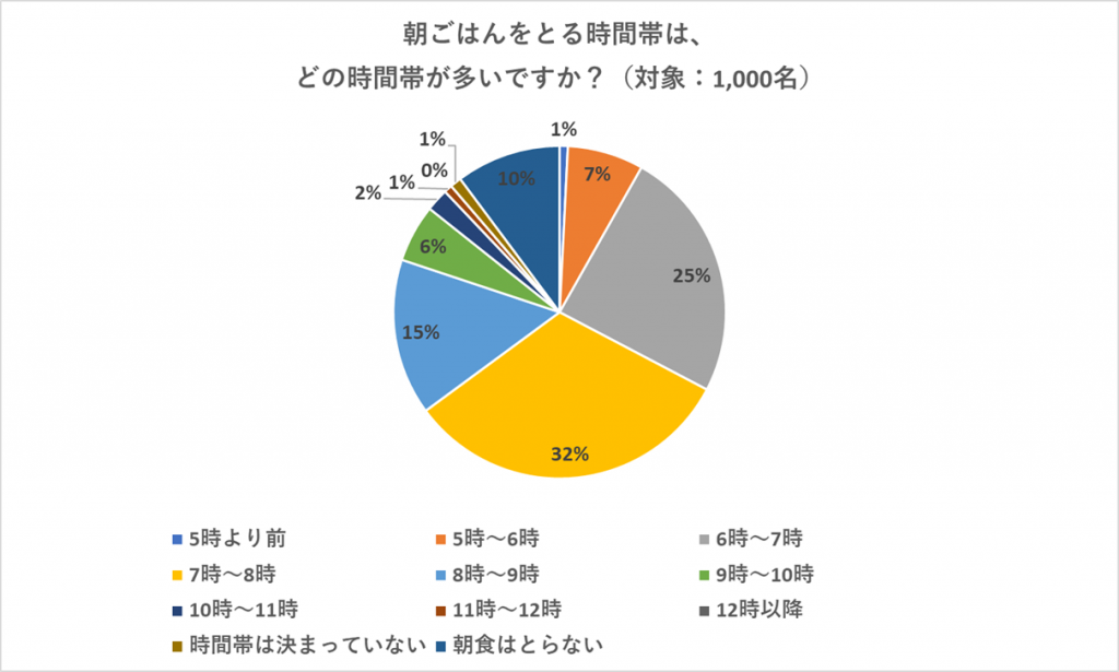 朝ごはんをとる時間については、「7~8時」と答えた人が32%と最も多く、次いで「6~7時」と答えた人が25%、8~9時と答えた人が15%でした。大半の人が、6~8時の間に朝ごはんを食べていることが分かりました。