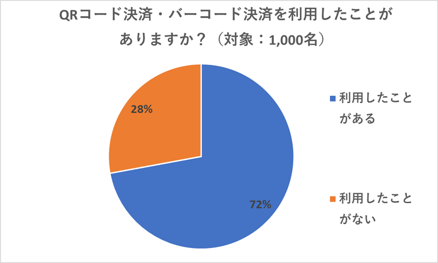 QRコード決済・バーコード決済を「利用したことがある」と回答した人は72%となっており、大半の人が利用したことがあることが分かりました。