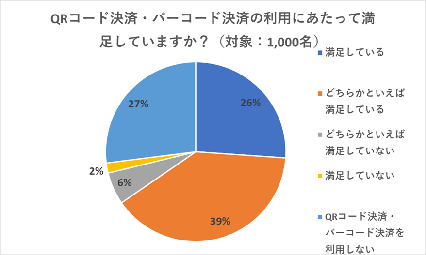 QRコード決済・バーコード決済の利用にあたって満足していますか?という質問に対して、「満足している」と答えた人が26%、「どちらかといえば満足している」と答えた人が39%となっており、合わせると65%の人が満足している結果となりました。