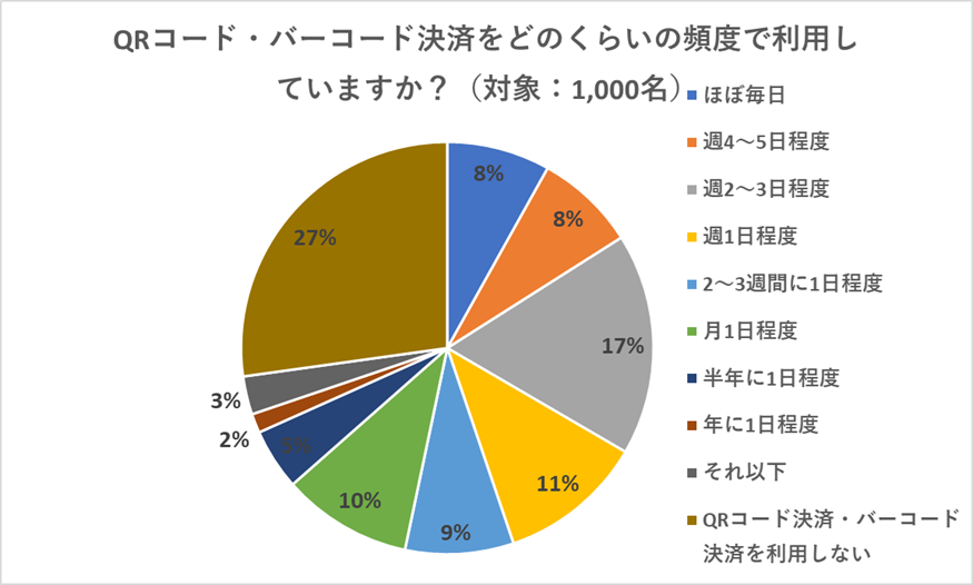 QRコード決済・バーコード決済の利用頻度については、「週2~3日」という回答が最も多く、17%でした。次いで、「週1日程度」と答えた人が11%、「2~3週間に1日程度」と答えた人が9%、「週4~5日程度」「ほぼ毎日」と回答した人が8%という結果になりました。