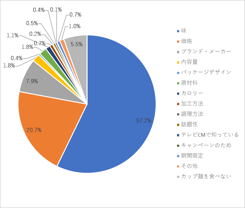カップ麺を購入する際、最重視していることは57.2%の人が「味」と回答しました。次いで「価格」が20.7%となっており、大半の人が価格よりも味優先で購入していることが分かりました。