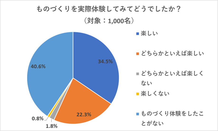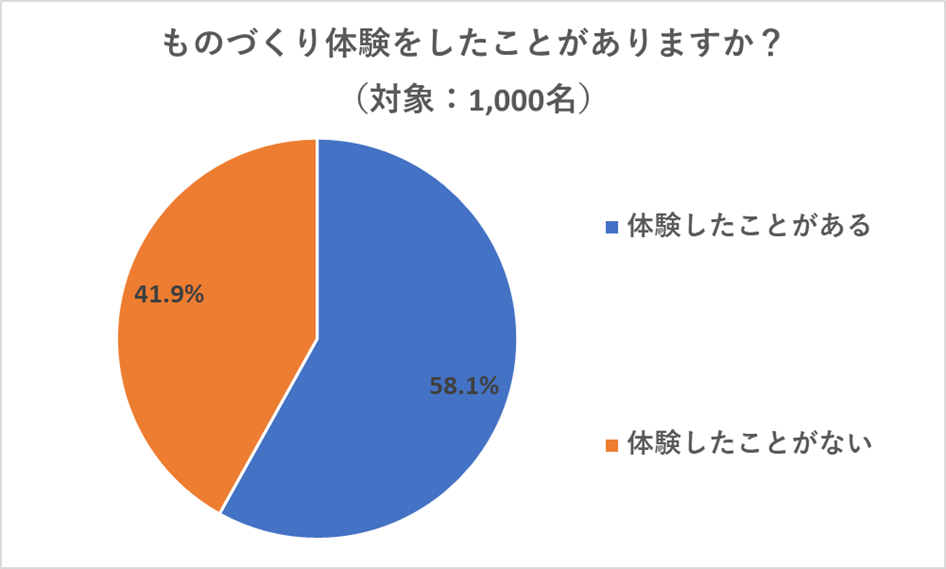 「ものづくり体験をしたことがありますか?」の質問に対し、「体験したことがある」と答えた人は58.1%という結果になりました。半数以上の人が体験したことがあるようですね。