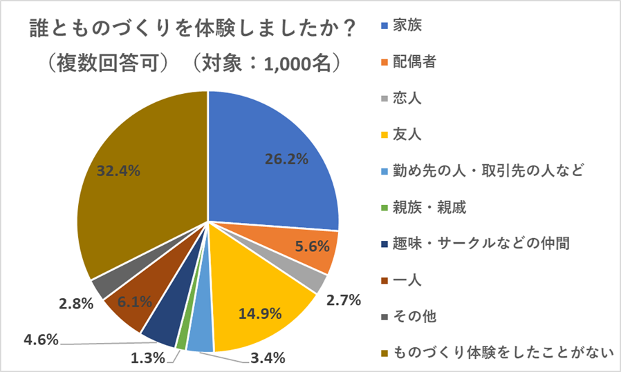 「誰とものづくりを体験しましたか?」(複数回答可)の質問に対して、最も多かった回答は「家族」で26.2%、次いで「友人」が14.9%、「1人」が6.1%という結果になりました。家族で体験された方が多いようですので、お子さんと一緒に体験されたりしているのかもしれませんね。