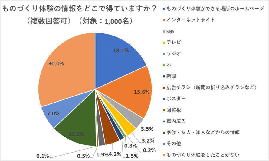 「ものづくり体験の情報をどこで得ていますか?」(複数回答可)の質問に対しては、「ものづくり体験ができる場所のホームページ」が最多で18.1%、次いで「インターネットサイト」が15.6%という結果になりました。実際にものづくり体験ができる場所のホームページから情報を得ている方が多いようですね。