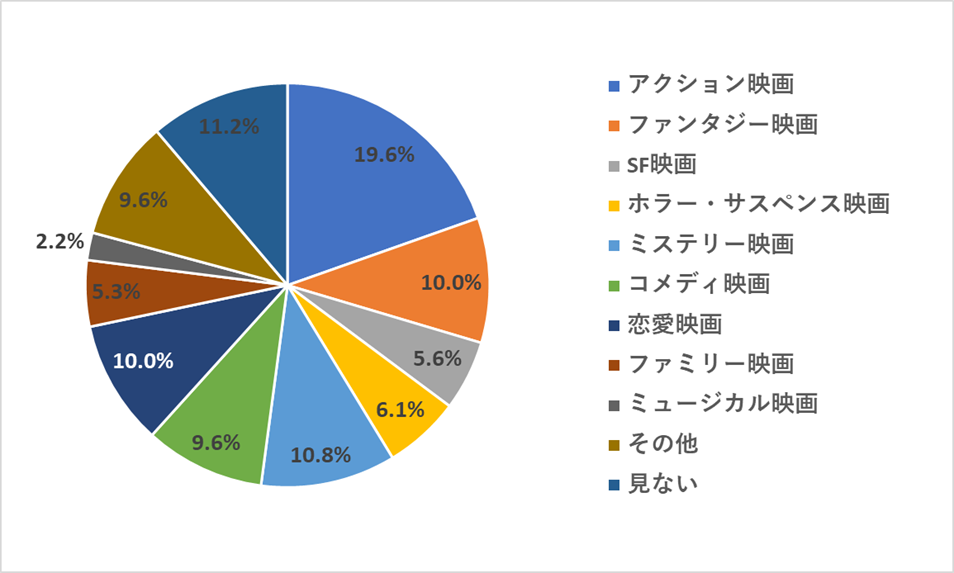 「どのジャンルの映画が好きですか?」の質問に対しては、「アクション映画」が19.6%、「ミステリー映画」が10.8%、「恋愛映画」「ファンタジー映画」が同率で10.0%という結果になりました。皆さん好きな映画のジャンルはそれぞれのようですね。