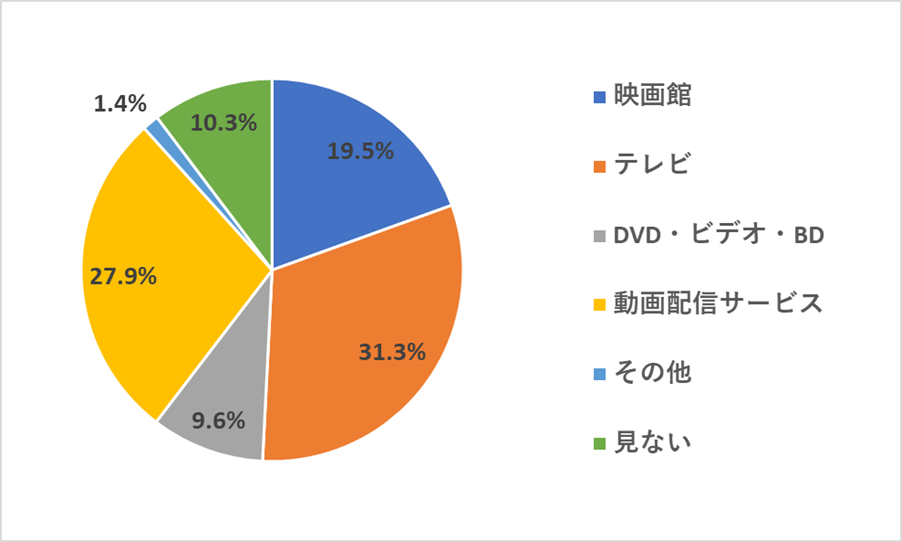 「どのように映画をみることが最も多いですか?」の質問に対し、「テレビ」が31.3%、「動画配信サービス」が27.9%、「映画館」が19.5%という結果になりました。皆さん、ご自宅で映画を楽しまれている方が多いようですね。