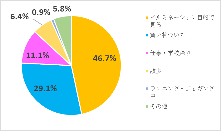 どのタイミングで見ることが多いですか?という質問に「イルミネーション目的で見る」と回答した人が46.7%、「買い物ついで」が29.1%、「仕事・学校帰り」が11.%、「散歩」6.4%、「ランニング・ジョギング」が0.9%という結果になりました。