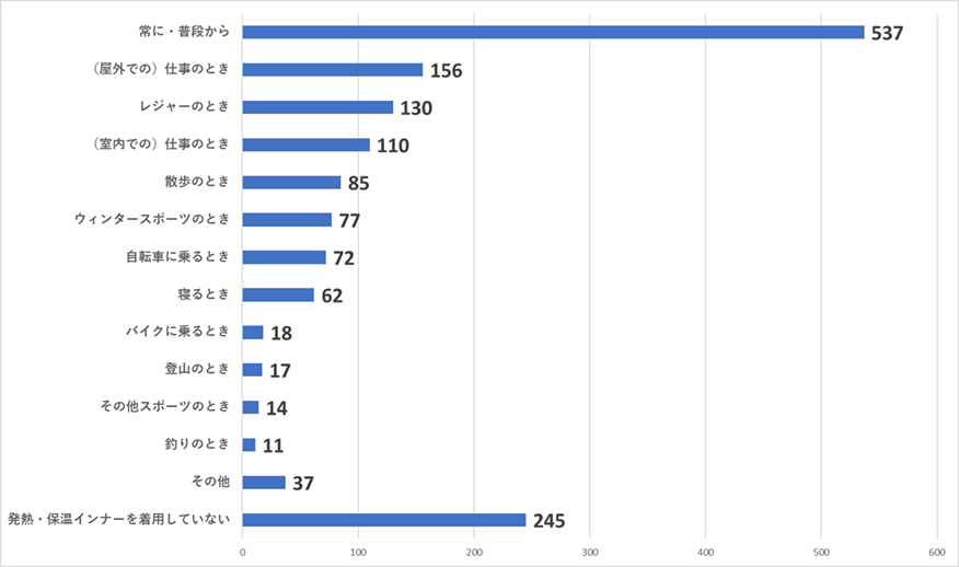 上記質問に対しては、「常に・普段から」と回答した方が回答数537で最も多くなりました。常に・普段から発熱・保温インナーを着ている人が圧倒的に多いことがわかりました。