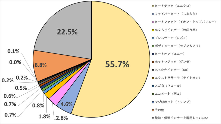 発熱・保温インナーのブランドは、「ヒートテック(ユニクロ)」が55.7%と一番多い結果になりました。2人に1人以上がヒートテックを着ていることがわかりました。