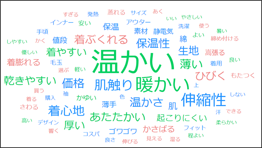 この結果からも温かい(暖かい・あたたかいを含む)を重要視していることが多くなっています。冬の時期に着るアイテムからもやはり譲れない点となっていることでしょう。