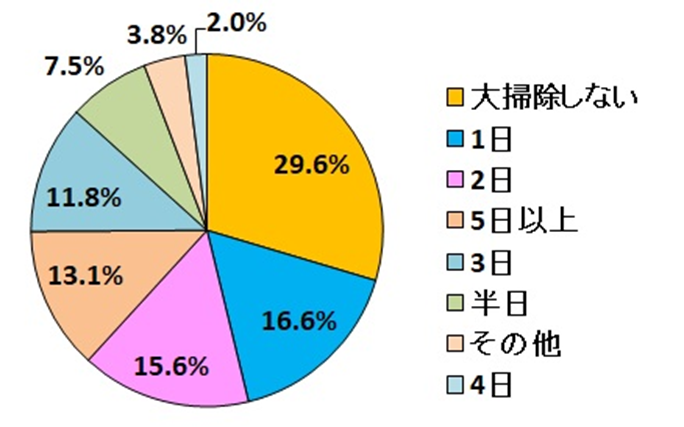 大掃除かける日数は飛びぬけた偏りはなく、生活パターンにより様々なようです。